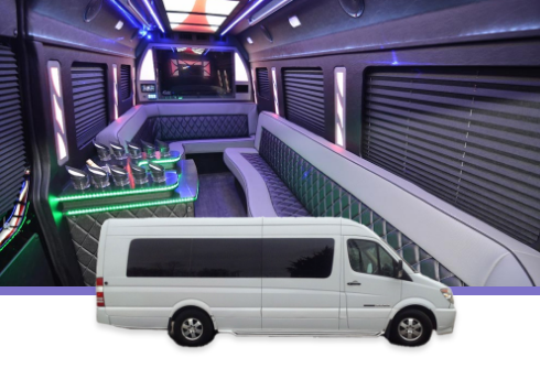 A Mercedes-Benz Sprinter Limo Bus is the perfect party bus for bachelor and bachelorette parties, nights out, and sport events.